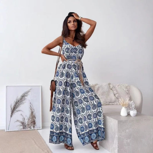 Women's Jumpsuit – V-neck – Spaghetti Straps – Wide Legs – Belt at Waist – Bohemian Style