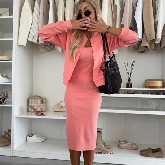 Women's Knitted Set – Slim Fit Cardigan with Buttons – Sleeveless Bodycon Dress