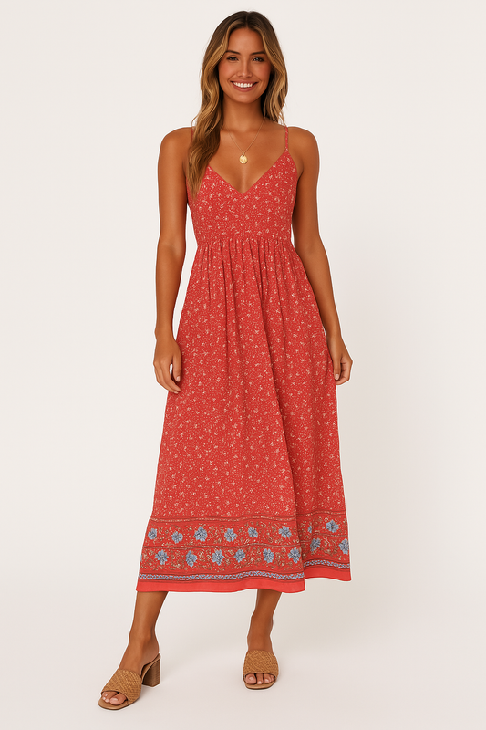 Women's Maxi Dress – Bohemian Cut – V-neck – Thin Straps – Light and Airy Fabric