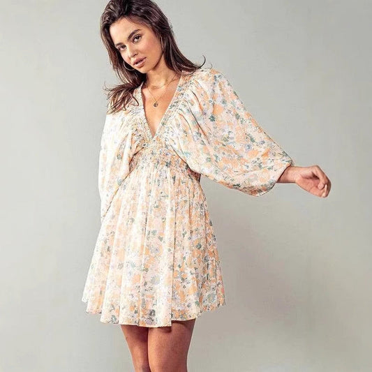 Dress for Women – Mini Length – A-Line Fit – V-Neck – Floral Print – Ruffle Sleeves