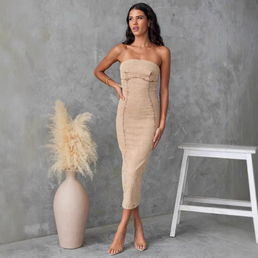 Dress for Women – Strapless Denim – Slim Fit – Midi Length – Seam Details