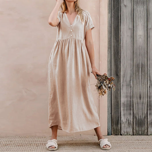 Dress for Women – V-Neck with Buttons – Loose Fit – Cotton-Linen Blend – Midi Length