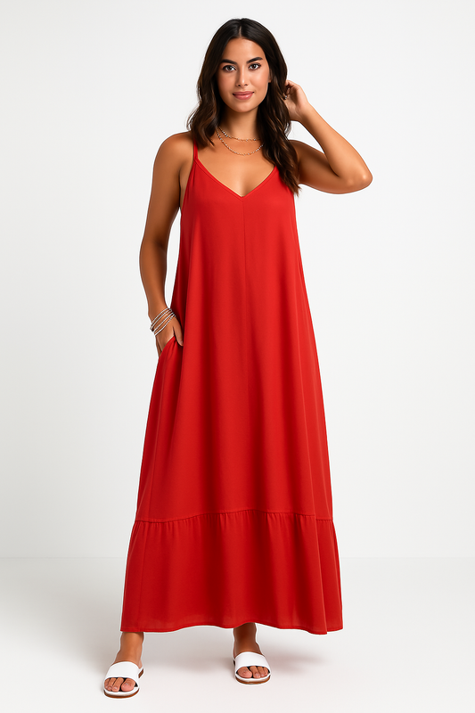 Dress for Women – A-line Fit – V-neckline – Tie Belt – Midi – With Pockets