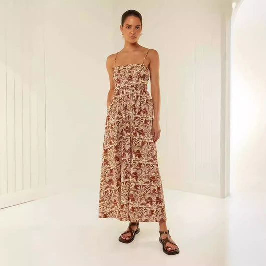 Maxi Dress for Women - Smocked Waist - Short Sleeves - Leaf Print