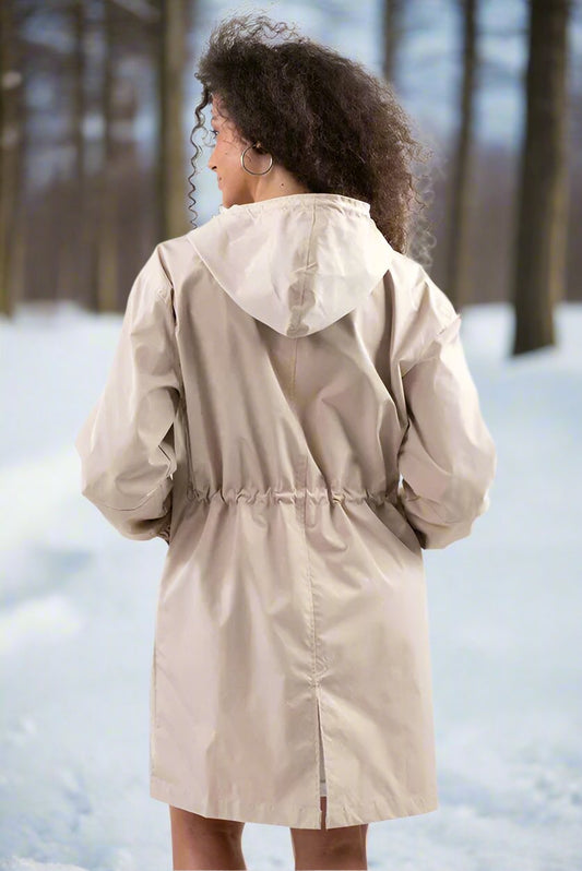 Thea Hooded Raincoat | Thigh-Length Zip Front Raincoat