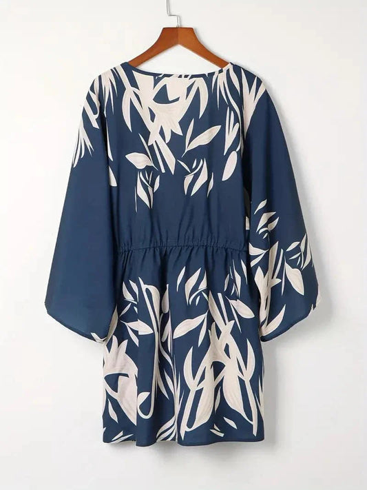 Women's Mini Dress – Floral Print – Loose Fit – V-Neck – Kimono-Inspired Sleeves