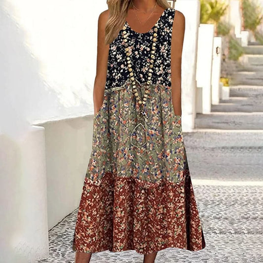 Women's Maxi Dress - Bohemian Floral Pattern - Sleeveless V-neck - Relaxed Fit