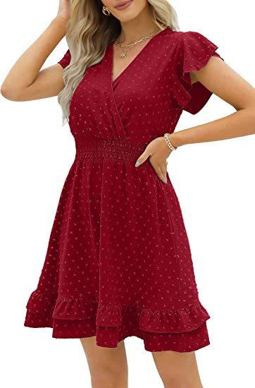 Women's Dress - Flared Sleeve, Wrap, V-Neck - Elastic Waist - Polka Dot - Ruffle Hem