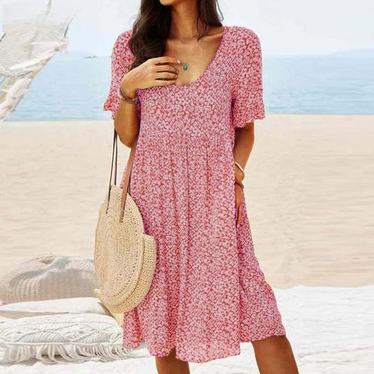Women's Dress - V-Neck - Floral Pattern - Loose Fit - 3/4 Sleeves - Elegant & Comfortable