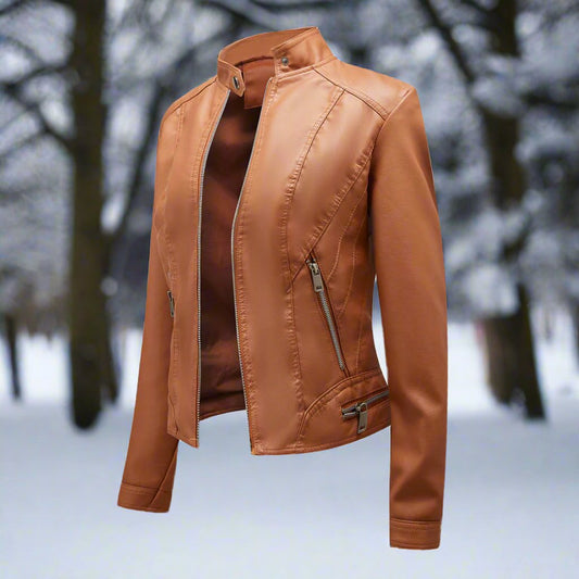 Women's Leather Jacket - Biker Style - Zipper Closure - Stand Collar - Slim Fit