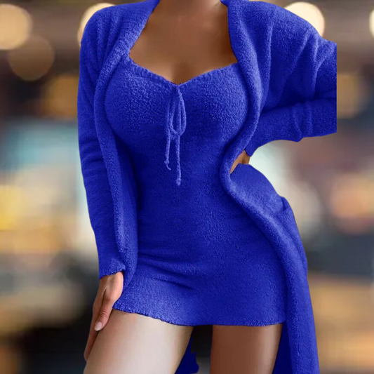 Women's Bodycon Dress - Textured Soft Fabric - Sweetheart Neckline - Mini Length with Cardigan