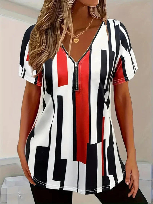Women's Blouse - V-neck with Zipper - Loose Fit - Short-sleeved Patterned Casual