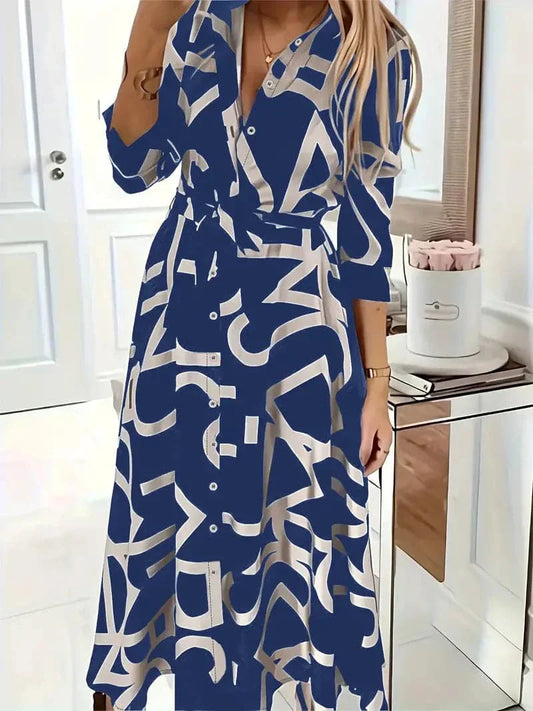 Women's Shirt Dress – Graphic Pattern – Midi Length – Adjustable Fit – 3/4 Sleeves