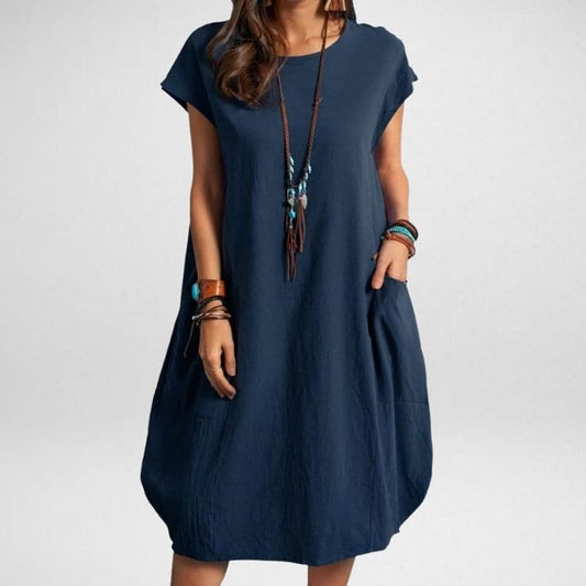 Women's Maxi Dress - Loose Fit - Round Neck - Knee-Length with Short Sleeves and Pockets