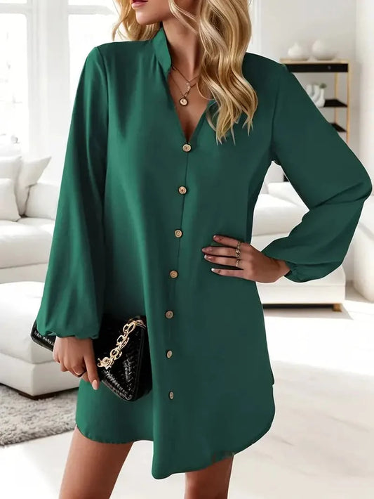 Women's Shirt Dress – Knee-Length – V-Neck – Long Sleeves – Elegant and Casual
