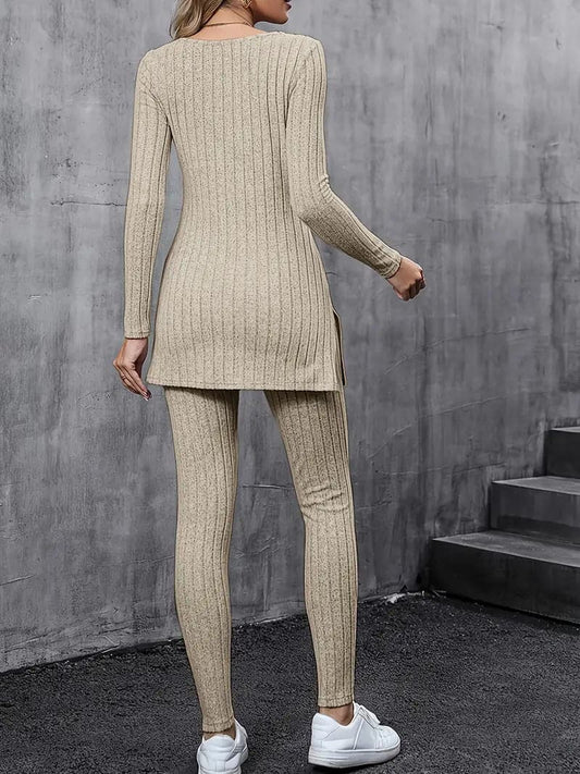 Dress in Ribbed Knit for Women – V-neck with Tie Detail – Long-sleeved – Comfortable Fit