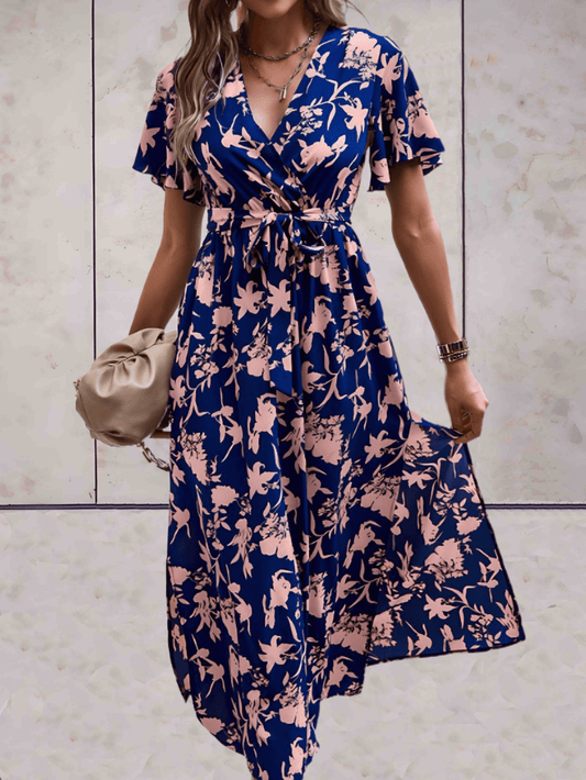 Women's Wrap Dress - V-neck - Short Ruffled Sleeves - Adjustable Waist - Midi Length