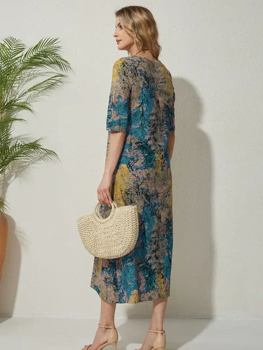 Women's Dress - Midi Length - Relaxed Fit - Elbow-Length Sleeves - Abstract Pattern