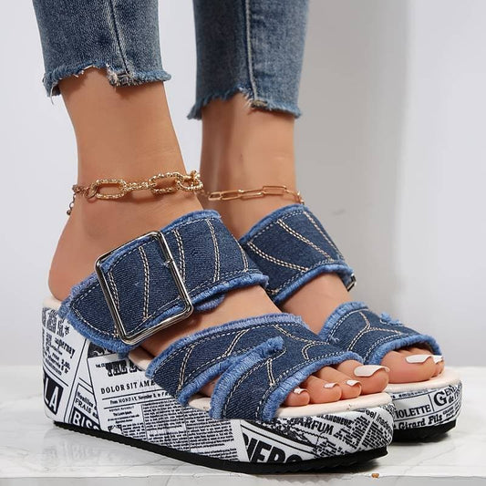 Women's Platform Sandals - Denim Fabric - Adjustable Buckle - Comfortable Wedge Heel