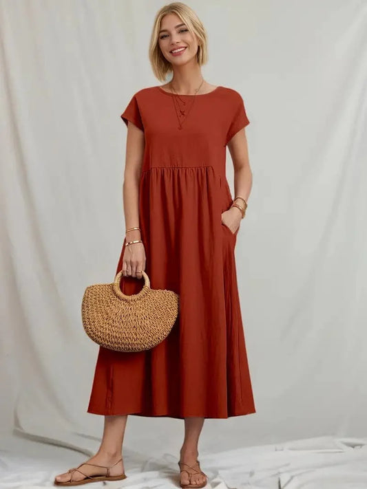 Dress for Women – Midi Length – Relaxed Fit – Round Neck – Short Sleeves – Light and Airy