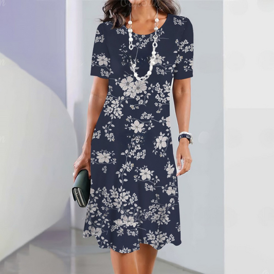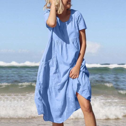 Women's Summer Dress - Loose Fit - Round Neck - Knee-Length with Short Sleeves and Pockets