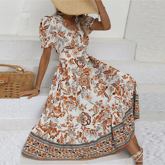 Women's Midi Dress – V-neck – A-line Fit – Floral Pattern – Short Puff Sleeves