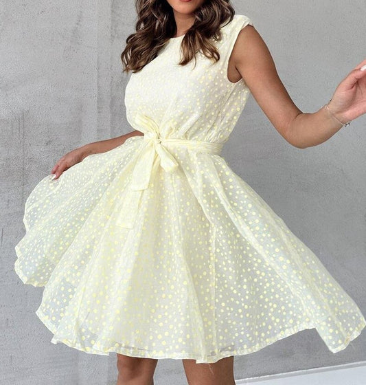 Dress for Women – Sleeveless A-line – High Waist with Tie Belt – Polka Dot Pattern