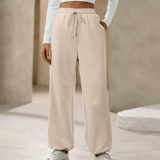 Women's Pants – Relaxed Fit – High Waist with Drawstring – Soft Cotton Feel – Full Length