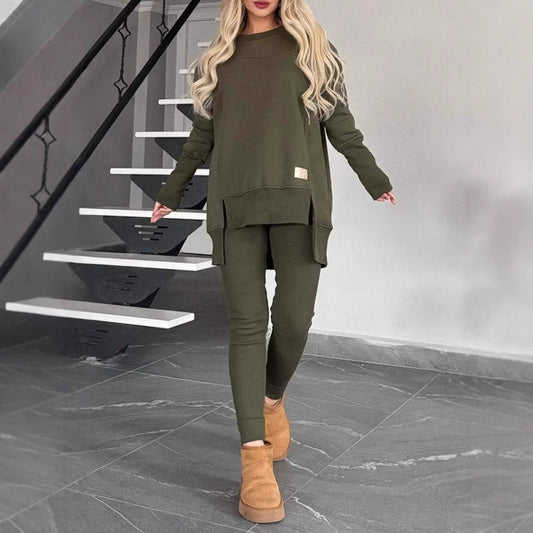 Women's Two-Piece Set – Asymmetric Long Sleeve Top – Wide Pants – Soft Cotton Feel