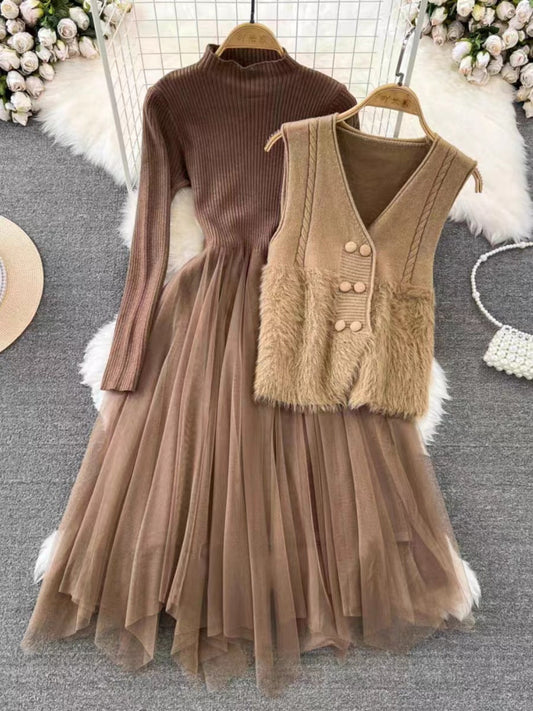 Women's Dress Set – Knitted Top – A-line Tulle Skirt – Sleeveless Vest