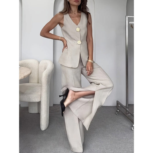 Women's Set with Top and Pants – Linen and Cotton – Wide Pants – V-neck – Relaxed Fit