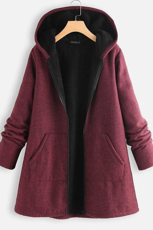 Women's Coat with Hood – Wool Texture – Fleece Lined – Oversized Fit – Zipper