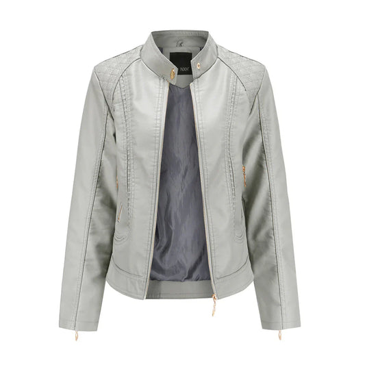 Women's Leather Jacket – Slim Fit – Quilted Shoulders – Stand Collar – Zipper Pockets