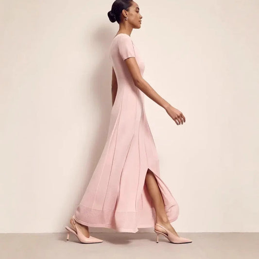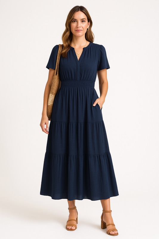 Women's Maxi Dress – Slim Fit – V-Neck – Short Sleeves – Breathable Pleated Design