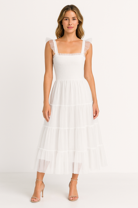 Women's Dress Long – Smocked Bodice – Tiered Mesh Skirt – Sleeveless with Ruffles