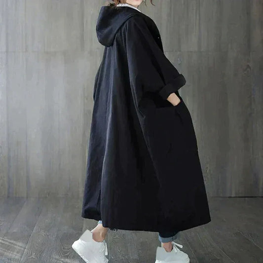 Women's Trench Coat – Oversized Fit – Hood – Full Length – Soft Cotton Feel – Buttons
