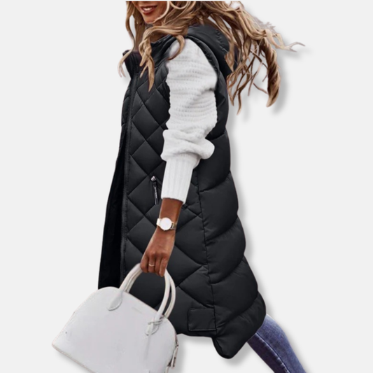 Women's Vest with Hood – Quilted – Relaxed Fit – Long Length – Zipper Pockets