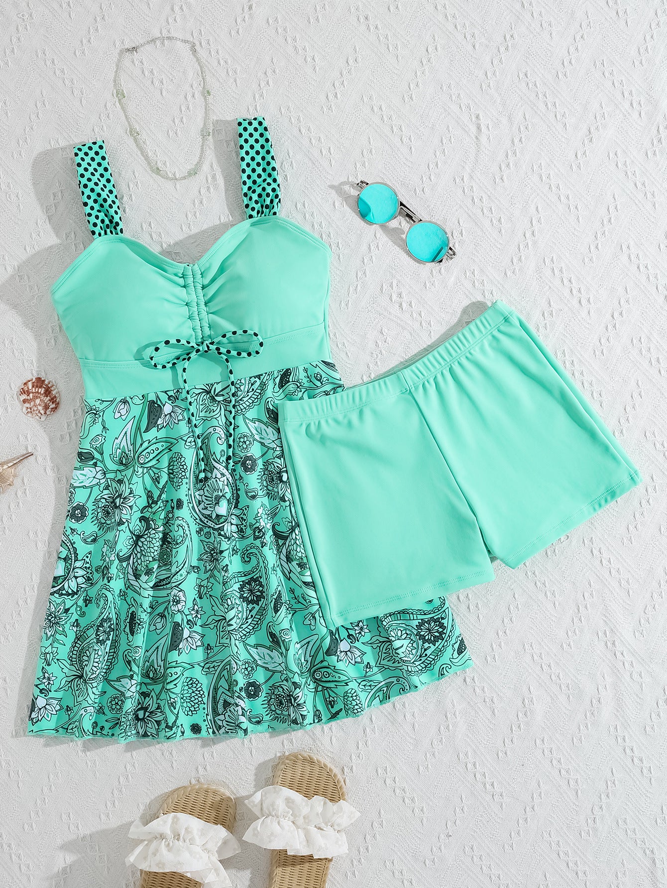 - Design: A-line fit with ruched bust, wide straps, and patterned skirt