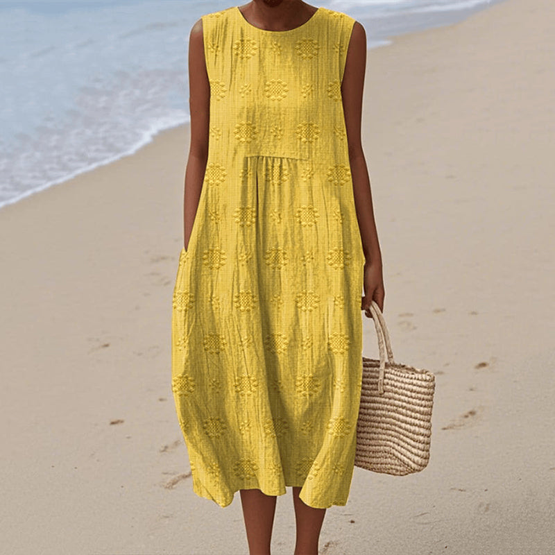 Women's Midi Dress – Loose Fit – Natural Fiber – Sleeveless – Floral Print – Side Pockets