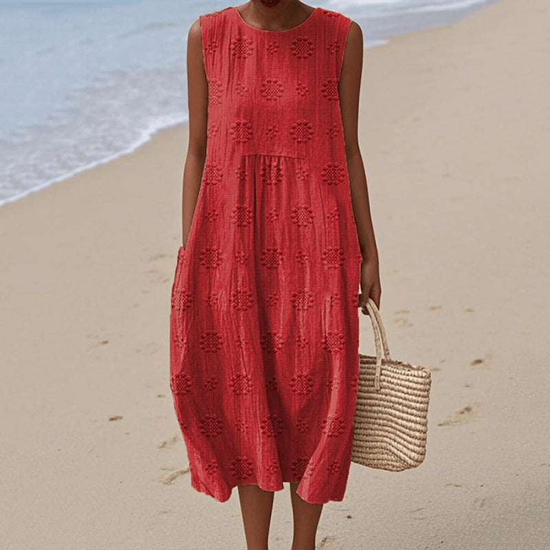 Wear this sleeveless midi dress with sandals for a perfect summer look, or add a light cardigan for cooler evenings. It is ideal for casual occasions and relaxed days.