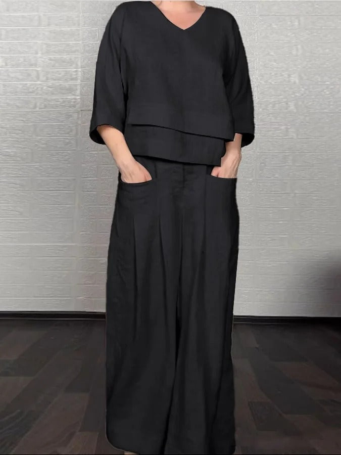 Women's Set – Oversized V-neck Top – Wide High-waisted Pants – Light Linen and Cotton