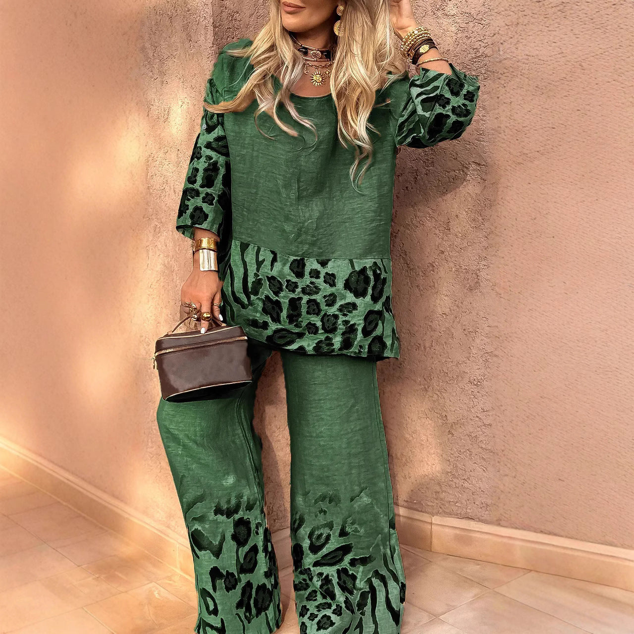 Women's Set – Wide High-Waisted Pants – Relaxed Top in Breathable Linen – Animal Print
