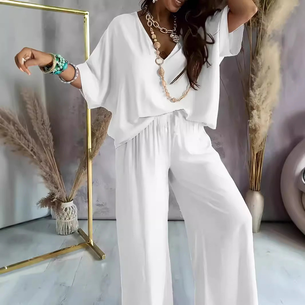 Women's Two-Piece Set – Deep V-Neck Top – Wide Pants – Relaxed Fit – Breathable Fabric