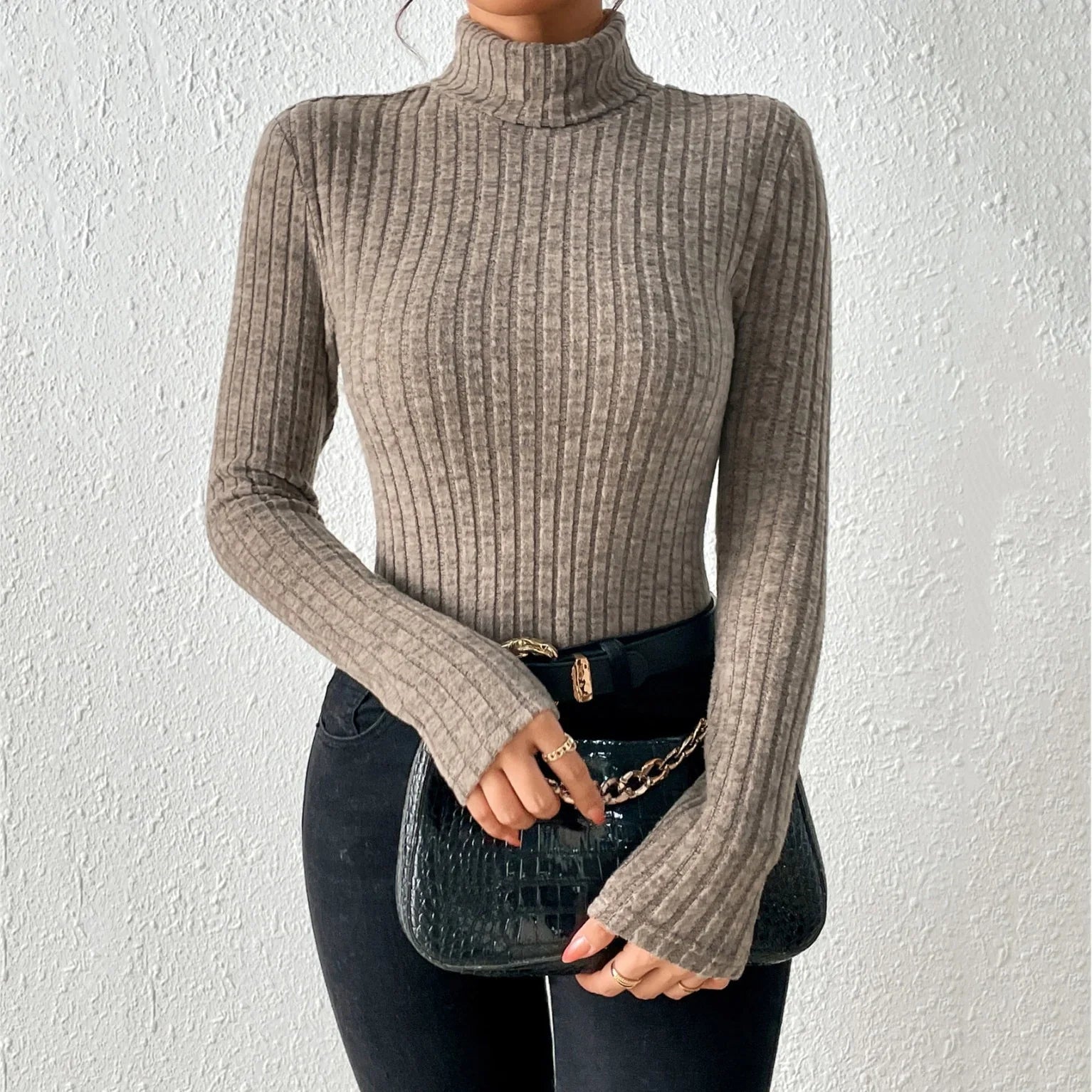 - Design: High neck, slim fit, ribbed knit