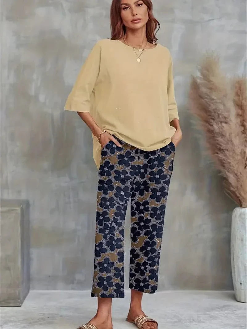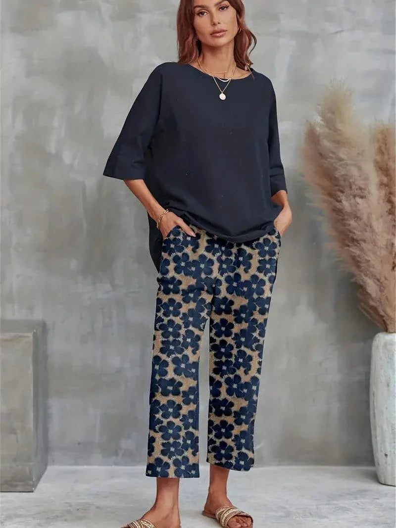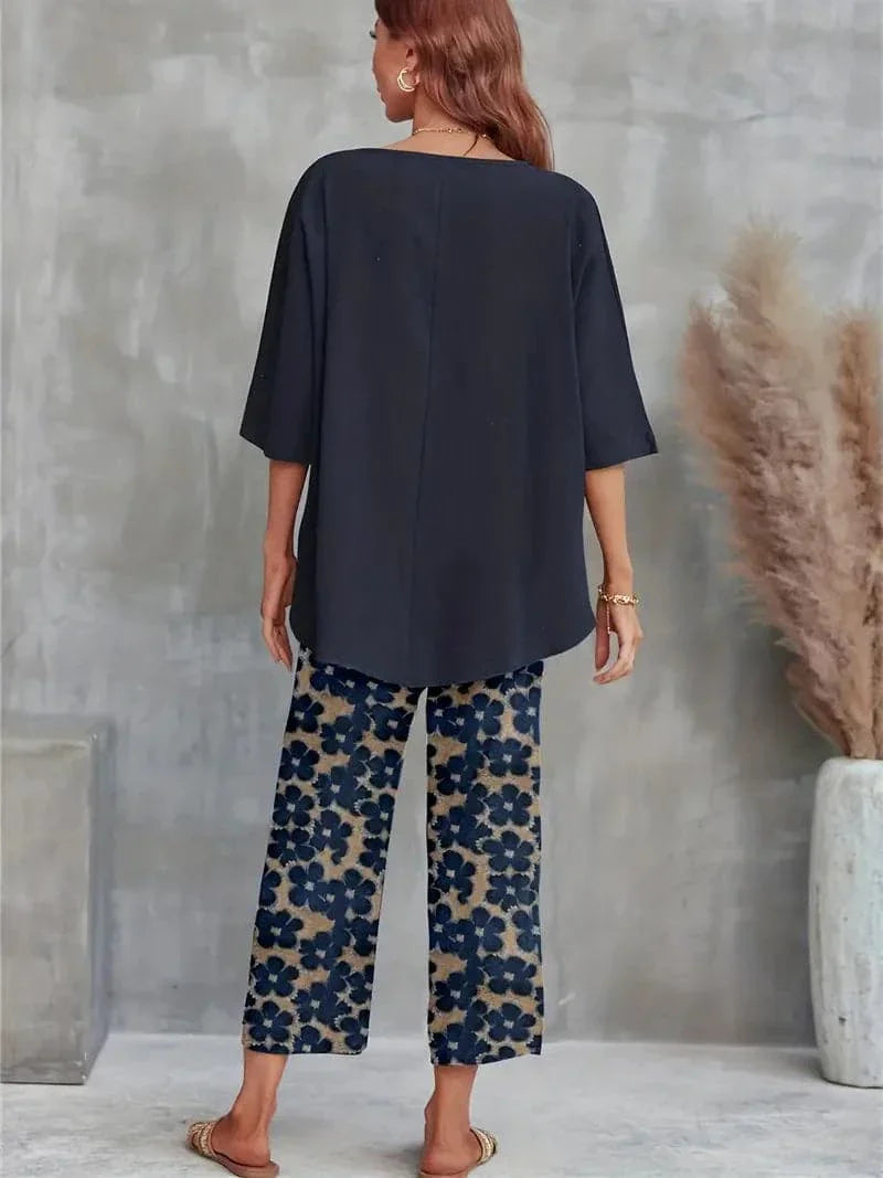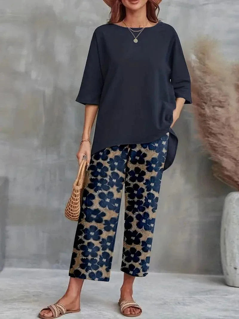 Top: Asymmetrical hem with a relaxed fit and mid-length sleeves for a comfortable yet stylish look. Pants: All-over floral print with navy and earthy tones, wide-leg silhouette for easy movement, and ankle length, perfect for pairing with your favorite sandals.