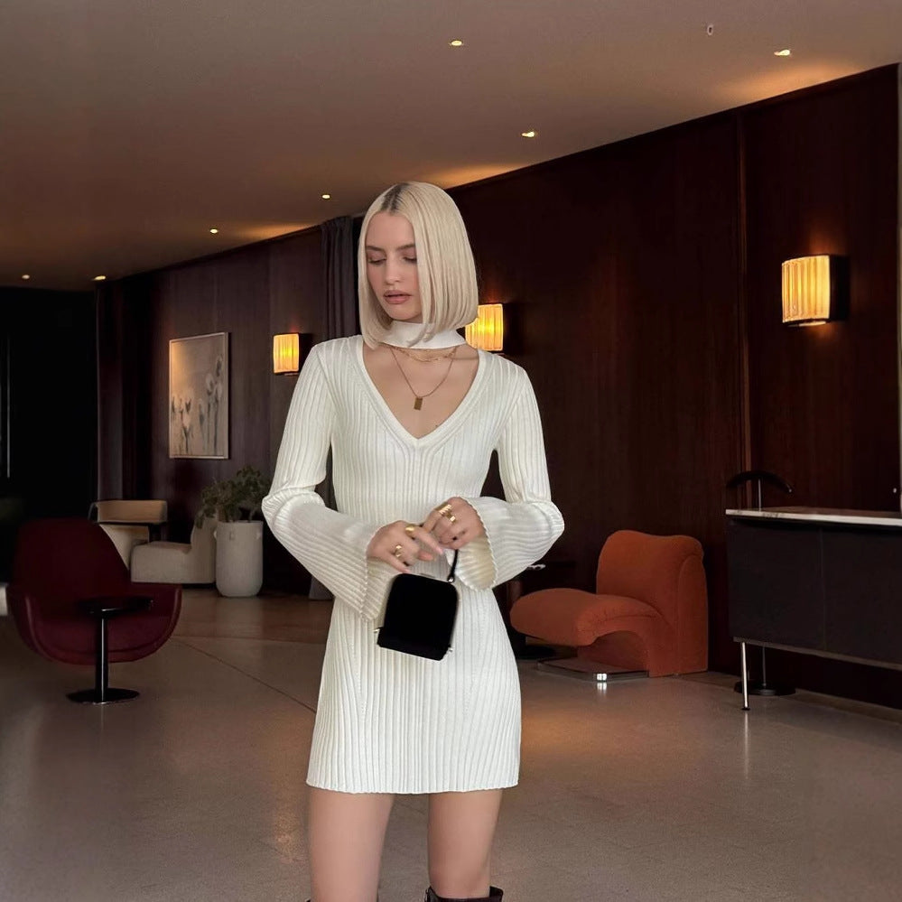 Dress woman – Ribbed knit – Slim fit – V-neck – Flared sleeve – Tie detail